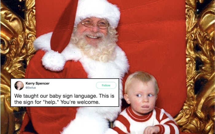 While not every family may choose to tell their kid about Santa, those who do all tend to look forward to one Christmas tradition in particular. That's right, going to the mall and sitting on Santa's lap to pose for a picture. And now, this viral photo of a toddler signing for "help" with Santa is making the rounds once again because it's seriously adorable and oh so hilarious.