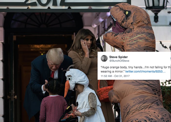 On Monday evening, the Trump family celebrated its first Halloween at the White House, where they took to the decorated South Lawn to hand out candy and greet visitors. And if you've been waiting for a tweet-worthy event this Halloween, don't worry — the White House trick-or-treating event definitely delivered. The internet now thinks President Donald Trump is afraid of a kid in a dinosaur costume, and the reactions online have been priceless.