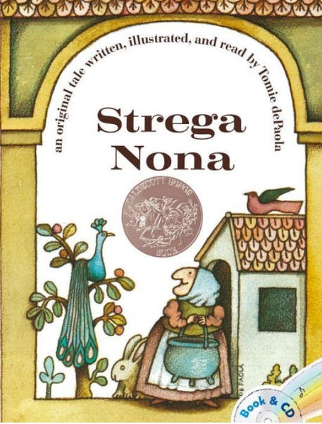 Strega Nona by Tomie dePaola, first published in 1975, tells the story of a grandmotherly witch who uses her magic to help others in her home in Calabria. When she leaves her assistant, Big Anthony, in charge of her home for a bit, he can't resist meddling with her magical pasta pot. I won't spoil the ending, but it's safe to say Big Anthony gets to carb-load as thanks for tampering with Nona's cookware.