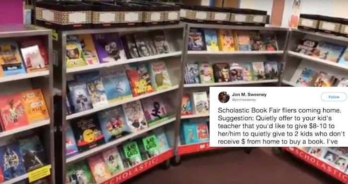 “Scholastic Book Fair fliers coming home. Suggestion: Quietly offer to your kid's teacher that you'd like to give $8-10 to her/him to quietly give to 2 kids who don't receive $ from home to buy a book. I've watched at the fairs the kids who wish they could buy a book, but can't,” the tweet read.