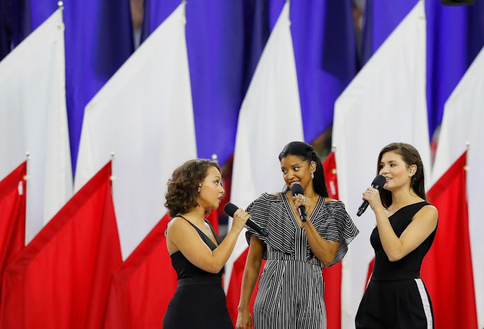 It's more than just an experience because they are the Schuyler sisters from Hamilton — the three women are women of color and came on stage in pantsuits, according to Bustle. With The New York Times recent report that President Trump has required women staffers in his office to "dress like women," the mention of both sisterhood and the fashion choices make it seem like the original Schuyler sisters were definitely using their moments on the stage at Super Bowl 51 to send a message to Trump, America, and everybody watching — who run the world? Girls.