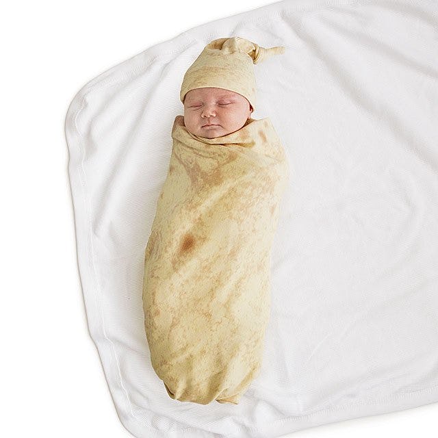 When you learn to swaddle your baby at the hospital or at birthing classes, one of the most common phrases the teacher will utter is "wrap your baby like a burrito." You fold over, then up, and roll your baby over until they're snug like beans and rice. While they don't instruct you to top your baby burrito off with guacamole (yes, I know it's extra), that's exactly what you'll want to do with this tortilla baby wrap and hat combination designed to look just like a flour tortilla.