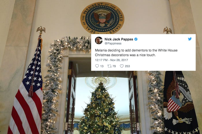 Every year, per tradition, the White House is transformed into a taxpayer-funded winter wonderland. And on Monday, the Trump administration released a video of first lady Melania Trump putting her decorative skills to use to make that happen this year. But there's one particular photo of the White House Christmas decorations that have people freaking out — and questioning humanity, to be honest.