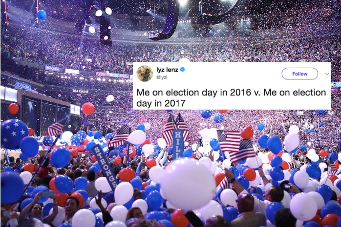 On Election Day 2016, I bopped out of my polling place and skipped down the sidewalk with my "I voted" sticker gleaming. I was all smiles as I called my 96-year-old grandma so we could celebrate the imminent election of the nation's first woman president. But now, a year later, my grandma often disgustedly laments everything — from President Donald Trump's proposed Muslim ban to the dishonesty of the "creeps" in his administration when I call her. And I'm the who feels like they're about to be 100 years old. And so much of the bereaved electorate is right there with me, as the memes comparing Election Day 2016 and 2017 that are currently taking over the internet show.