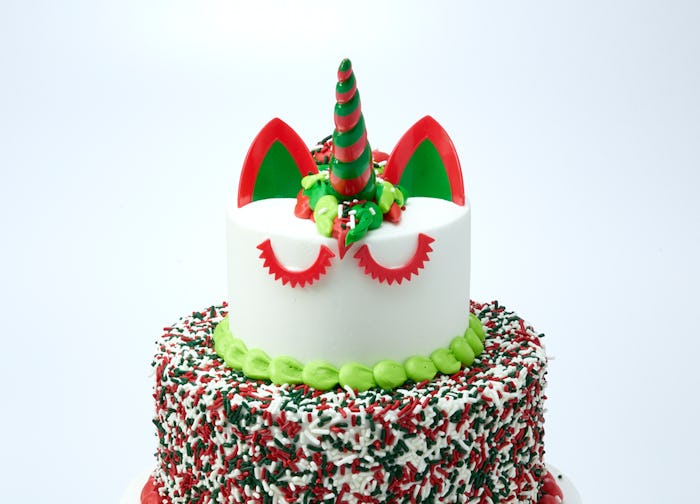 The three-tiered version of the Christmas unicorn cake — featuring a sleepy unicorn head complete with green-and-red ears and a horn — is priced at $70 and feeds 66 people. It's available in either vanilla or chocolate. If that's a bit too much cake for you, never fear; there's a two-tier version that's equally as festive.