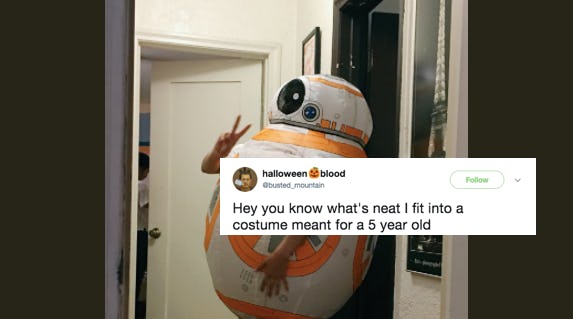 As a parent, I'm willing to go on record and admit that I have suffered frequent bouts of costume envy. My sons always seem to have so many fun options that have nothing to do with looking sexy and/or ironic (both of which appear to be the two caveats for women's Halloween costumes). I have been especially jealous of all things Star Wars-related. So when I saw these photos of a grown woman wearing a 5-year-old's BB-8 costume, I was impressed. Well played, madam. Well played, indeed.