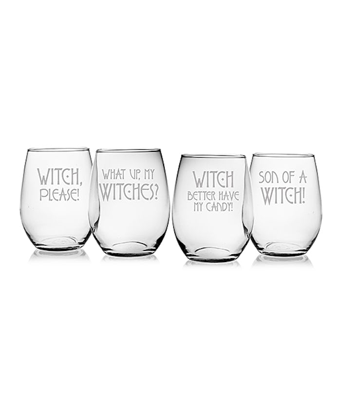 There’s nothing quite like the fun of trick-or-treating and the rush that comes from not knowing if the biggest candy bar is waiting for you at the next house... or if instead you'll be handed a travel-sized toothpaste (a dentist lived on the street I grew up on). While I don’t recommend going solo trick-or-treating dressed as an oversized ghost, there’s still a way for adults to get their kicks on Halloween and it's with these witch wine glasses. The set includes four dishwasher-safe stemless glasses (I’ve never met a traditional stemmed glass I didn’t break, so I’m firmly in camp no-stem) each inscribed with a funny, witchy pun.