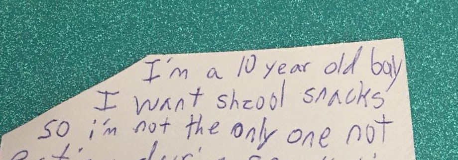 The tag read, "I’m a 10-year-old boy. I want school snacks so I’m not the only one not eating at snack time at school. I wear size 12 and I like Pokemon.” You have to hand it to the kid to asking for some Pokémon swag, too, but the fact that his main wish was to have some snacks to eat in class is totally heartbreaking. Can we get him all the snacks?