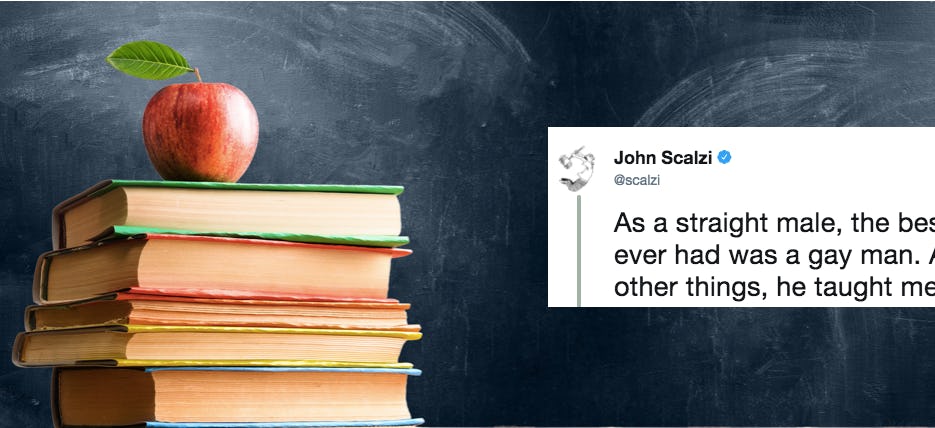 Over the weekend, someone tweeted a homophobic question implying that kids shouldn't have gay teachers. But from the ashes of that idiotic tweet rose a flawless response from author John Scalzi. Scalzi's post about his gay teacher, Keith Johnson, is a beautiful remembrance of an inspiring man. For those who read it, it's sure to call to mind memories of those amazing teachers who end up shaping the lives of students long after they leave the classroom.