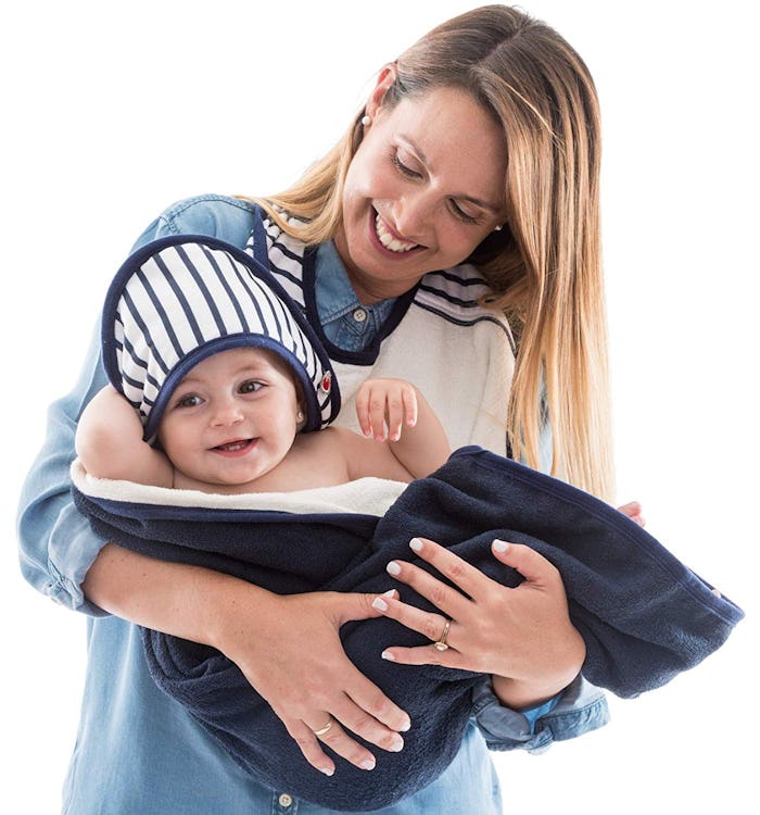 The towel is part apron, part hooded bath sheet, and there's nothing else like it on the market. It's pretty big at 43 by 41 inches, and it's 100 percent cotton. Makers Baby to Love stated that it's up to three times more absorbent than regular towels, which is a real boon when you're trying to wrangle a newborn who is really unhappy about being wet and naked. It is especially warm and heavy thanks to the fact that it's manufactured from two towels stitched together, making it that much more cozy for baby.