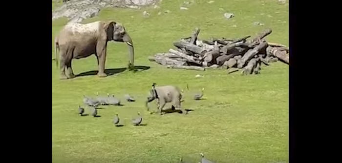 If you have a toddler, you'll understand what I mean as soon as you watch the video. In the clip, a baby elephant named Chindi is chasing birds around a green field at Sweden's Boras Djurpark zoo, according to KSL. You could tell by the little pachyderm's run that it's the funnest thing to have ever fun'd. But, at one point, the excitement becomes too much for the baby elephant, and she loses her balance. The accidental spill shakes up the little one, and she goes running to her mom — because that's what toddlers do.