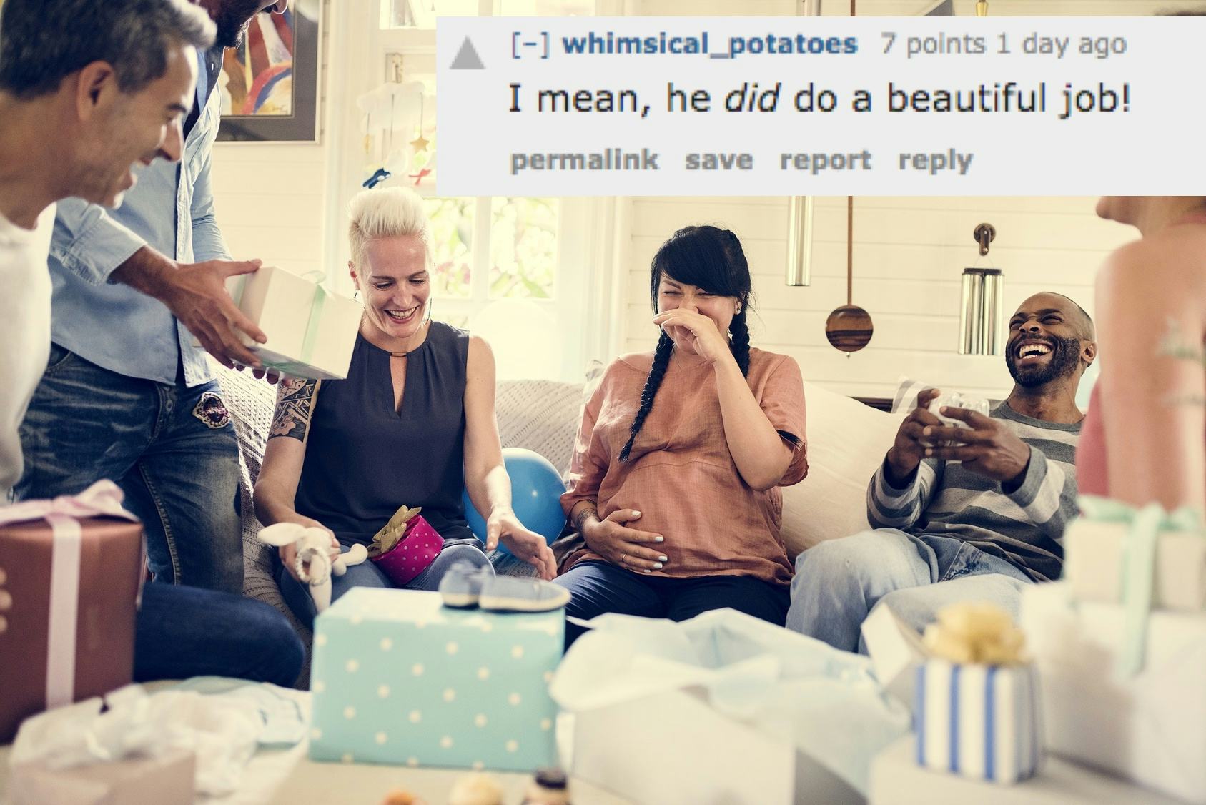 I mean, would you look at this? Reddit user morrisonismydog tells Romper that her husband made this terrifying, awesome piñata for a baby shower she was hosting after spotting a muffin-shaped piñata at the 99 cents store. (A muffin-shaped piñata. That he turned into a vagina. This story is so good, y'all.) He then did a little creative work to make the muffin less muffin and more... well. You know. And of course, muffins don't usually come with a clitoris and labia (how could you not notice these here), so all we can gather here is that morrisonismydog's husband knows more about female anatomy than most of Congress.