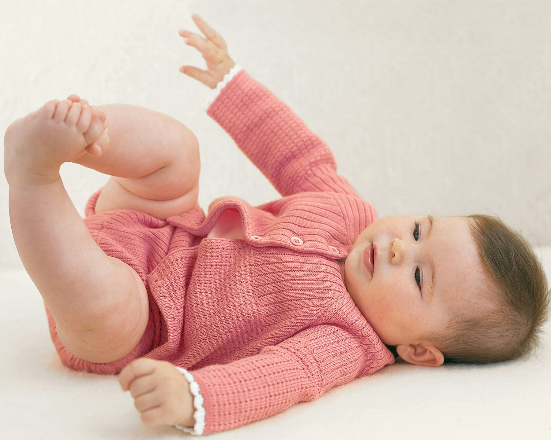If you happen to have a little Duchess to dress, you're going to swoon over the Royal Baby Duchess Set. The color of this set is not quite pink and not quite coral, but hovers somewhere in the salmon family and is beyond beautiful. The dainty white crocheted trim on both the wrists and the bottom edge of the sweater is supremely elegant, while the three tiny buttons boast a flower petal design. The girls' sweater set includes matching bloomers with elastic leg holes that are both comfortable and practical for babies on the move.