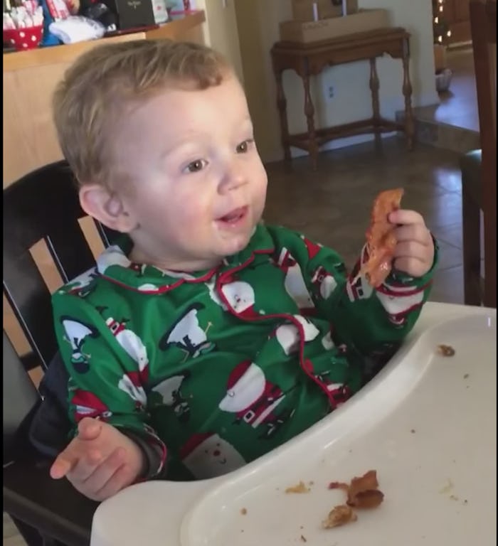 Take little Easton Beach, for example. This little dude’s video showing him try bacon for the first time is going viral, in part because our country is obsessed with bacon, but also because his reaction is priceless. The young toddler was given a piece of bacon to try on Christmas morning and you can tell by the look on his face that he was in heaven, closing his eyes, smacking his lips, chewing it up and then biting down for more. He even started shouting, “Bacon!” (or more like “Bayguhh!” but we get it):