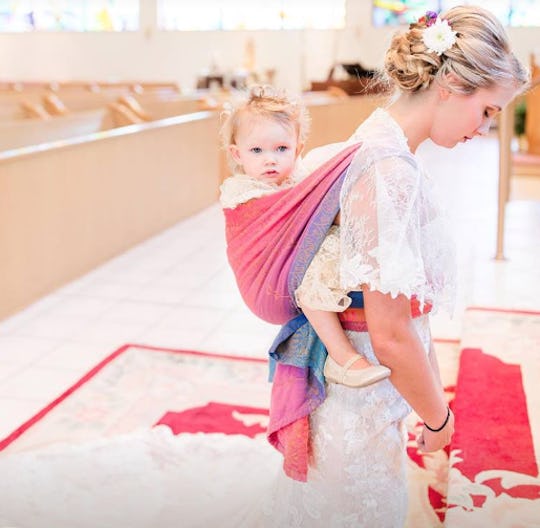 I have been to a ton of weddings, no brag but I have. If I could, I would go to a wedding once a month because I love seeing how inventive people get when trying to incorporate their actual life into the fantasy one-day life of a wedding. Especially when little kids are concerned, because they're obviously the best part. And if you can incorporate one of those kids in a practical way, chef kisses all around. I was blown away by this babywearing bride's photos for just that reason; not only was this a practical way to incorporate her daughter into the celebration, it was also seriously gorgeous. I hope this becomes a trend as soon as possible.