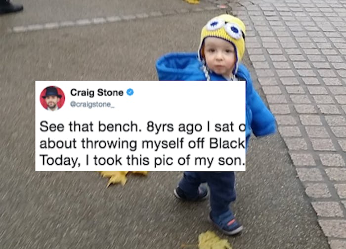One tweet and photo can hold so much power. Not only can the 280 characters tell a story, but the visibility of one tweet can gain so much attention from so many diverse people. English writer Craig Stone's story does just that. In a tweet, written on Sunday, Stone tells his own story of one bench overlooking a body of water. "See that bench," Stone wrote. "Eight years ago today I sat on it thinking of throwing myself off of Blackfriar's Bridge."