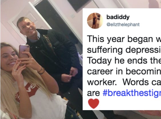 Parents often reiterate how proud they are of their children, but it's much more striking when those kids grow up and support and applaud their parents, and even help them deal with some serious issues. Perhaps that's one of the many reasons this one daughter's tweet about her dad overcoming depression is resonating so hard on social media and beyond. What started out as 19-year-old Ellie Wilkie's heartfelt ode to her dad after he went from having attempted suicide to starting a new job as a recovery support worker in less than a year has mushroomed into a global conversation about stigmatizing mental health. And it's just the type of story that so many families may need to know, that there's always hope when it comes to mental health crises — and the critical value of family support.