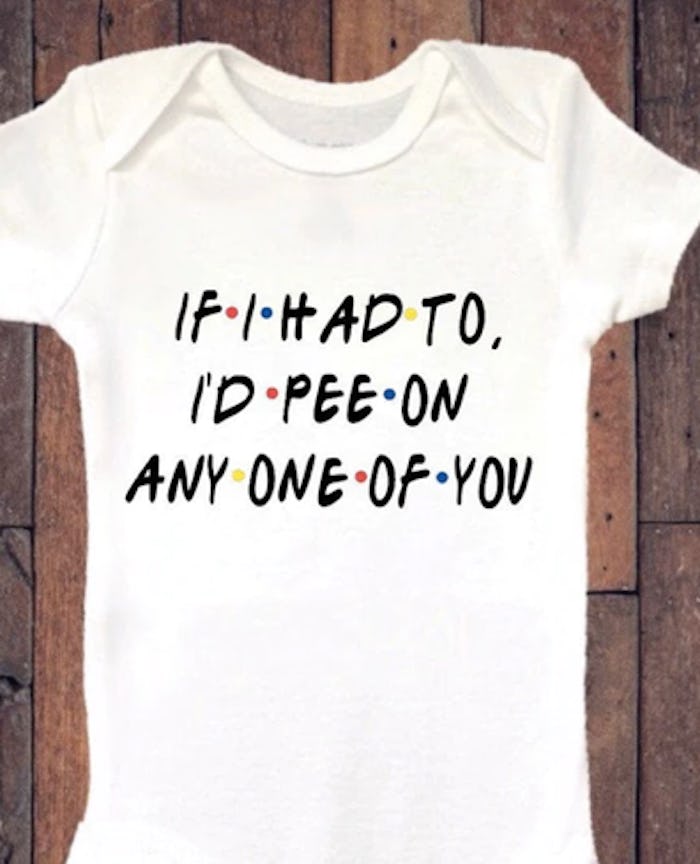 While each of the Friends onesie designs available will likely garner plenty of "Oh. My. God." reactions from fellow fans, the "If I had to, I'd pee on any one of you" design truly takes the cake as far as laughter-inducing quotes that work for both Joey Tribbiani and your baby go.