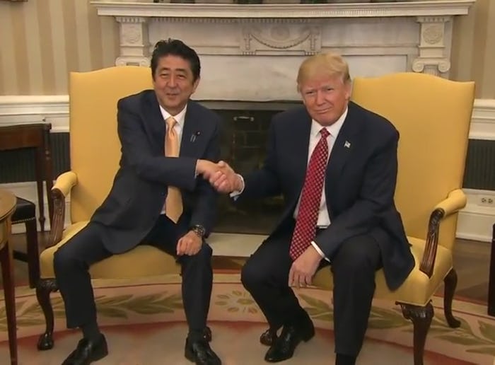 Two world leaders met on Friday and talked about who knows what, because everybody was too busy discussing Japanese Prime Minister Shinzo Abe and President Donald Trump's weird handshake to ask them. This GIF of the Japanese prime minister shaking Trump’s hand gives you some idea of just how awkward it was, but the handshake went on nearly twice as long. CNN clocked it at a full 19 seconds, and watching the full video of the handshake with sound gives some insight into what was going on.