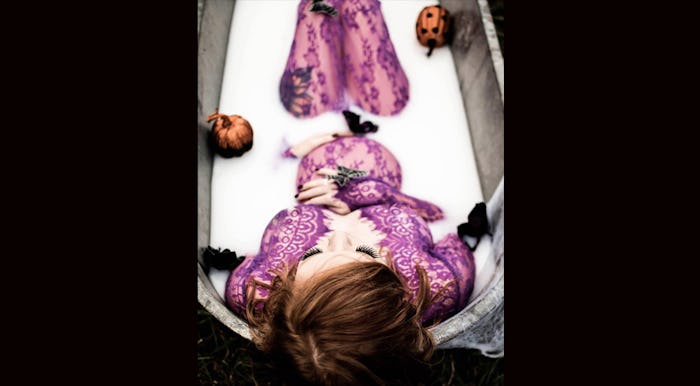 As for why this shoot is so breathtaking? Well, it involves a milk bath, a stunning floor length gown, and the perfect selection of Halloween decorations.