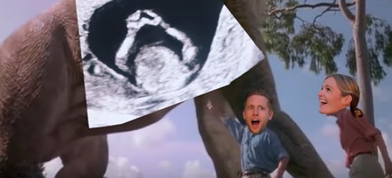 Instead of finding any actual ancient reptiles, the couple discovers a sonogram of a crying baby, badly superimposed over the image of a brachiosaurus. (Hey, this is according to Popsugar, I can't generally tell one dino from another. I've tried. Memorizing the difference between a Diplodocus and an Apatosaurus is just not one of every mom's talents, okay?)