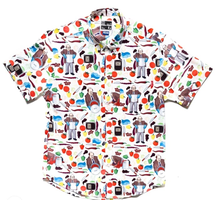 This short-sleeved button down shirt is made by retailer RSVLTS, and if you don't already love their wacky pop culture designs printed on high-quality clothing, get ready to give them all of your money after a quick spin through their website. It's the ultimate one-stop-shop for fans of wearing clothing with the likeness of Bob Ross, characters from The Sandlot, Kelly Kapowski, and now Kevin Malone from The Office.