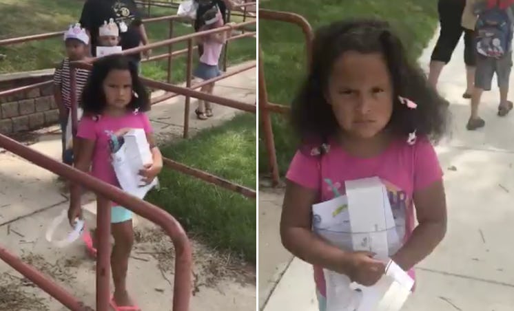 A Twitter user posted a video on Wednesday of her daughter coming out of school on her first day of kindergarten. Honestly, I wish I got to go to this kid's school; everyone is wearing a paper crown and high-fiving the teacher on their way out and merrily skipping towards their parents. It doesn't look half bad to me.... but it definitely wasn't sitting well with at least one little girl named Brielle. As the kid in front of her set off to skipping away, she was full on eyeballing her mom, who captioned the video, "How my daughter feels about starting kindergarten."