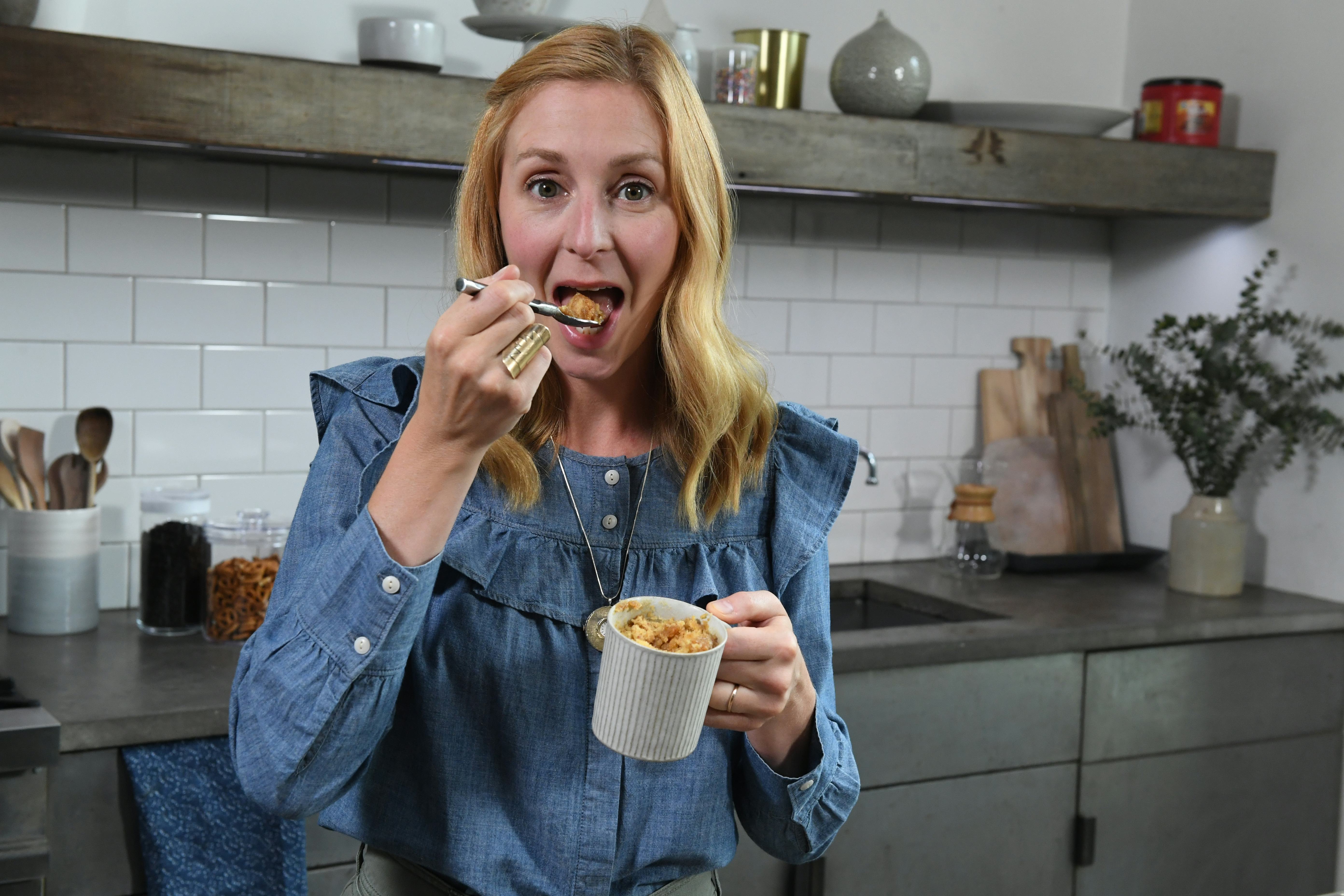 Tosi may have two James Beard awards under her belt, but this mug cake creation, the Coffeehouse Pretzel Mug Cake with Honey Drizzle, is doable for amateurs and expert chefs alike. "The microwave mug cake is the easiest thing. My nieces are always like, 'We want to help, we want to help!'” Tosi tells Romper. The recipe plays with the sweetness of the cake and honey with the saltiness of the pretzels, and it makes two mugs, so you can share it or double fist it yourself... whichever you prefer.