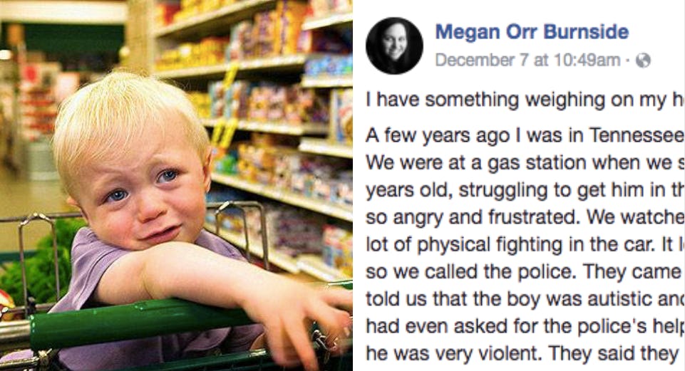 The police came and left, and soon Burnside received a call from the police, explaining the boy had autism and that his mom often struggled with him. In fact, she had even asked for officers' help in the past because he became particularly violent. The department has been helping this mom, the officer said, and she's doing the best she can. "I had the most overwhelming realization of my mistake," Burnside wrote. "In my eagerness to protect the child, I neglected to offer help to the mother. Instead I 'turned her in' to the authorities. We sat and watched her struggle and called her in. I have felt guilt even years later that I didn't get out of my car and offer her some help. If I had helped in that moment, it may not have led to more violence."