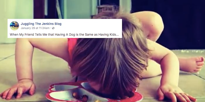 I have a pet dog who is sleeping at my feet right now, and she is one of my favorite beings on this planet. She is 15 years old and she sleeps 21 hours a day. The other three hours she likes to spend alternately eating and staring lovingly at me, what's not to adore? Yet I also have human children. And it's not the same thing, despite some pretty insistent arguments to the contrary. Especially when this mom compared having kids vs. pets in a viral video on Facebook, and got everyone all riled up. The dog "moms" don't like to be dismissed as somehow lesser than people moms.