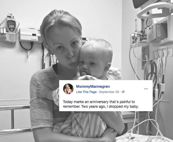 Mannegren's story sounds like many other mothers'. She was carrying her infant son across the living room toward the kitchen, just like she did any other day, when he flipped backward out of her arms "with all the strength and speed of a tiny acrobat" and landed on the floor. "In mere seconds, a perfectly normal day turned into an absolute nightmare," Mannegren wrote on Facebook, sharing a picture of herself and her son in the hospital. "We rushed to the ER with a whimpering baby and this mama in tears."