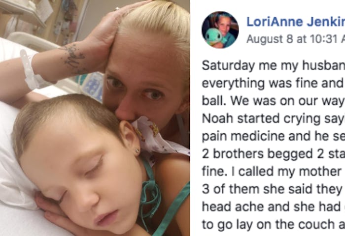 In the post, Surrett said that she gave him some children’s pain medication and left him with his grandparents, but the headache persisted the next day. Then, as she shared on Facebook, she received what she called "the scariest call of my life." Her mother-in-law knew something wasn’t right with Noah, who was unresponsive, and urged Surrett to get over to the house quickly while she called emergency services. While the paramedics were treating Noah, they noted that he had a fever of 102.3 degrees and was suffering seizures, Surrett wrote on Facebook.
