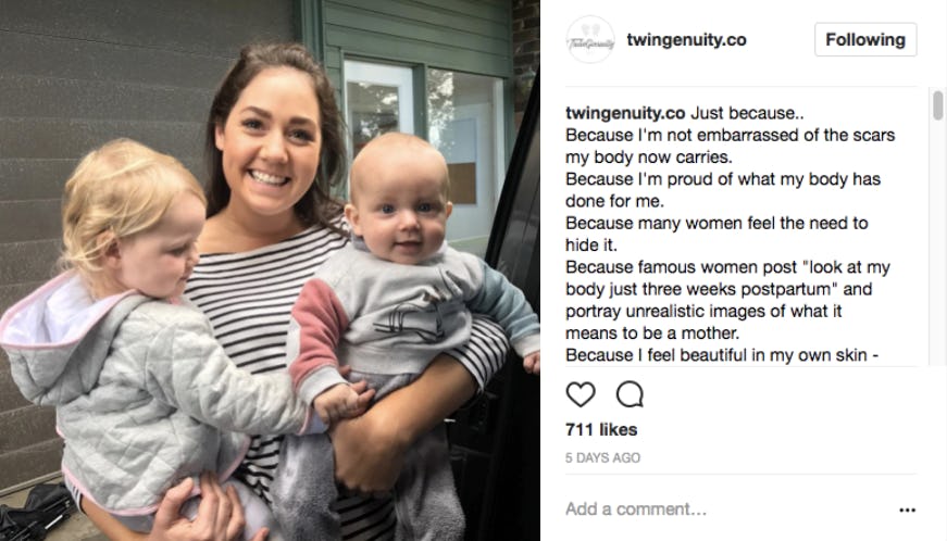 On Sept. 5, Australian mom Eliza Curby took to Instagram to share an image of her postpartum body — scars, loose skin and all. The woman behind the Twingenuity blog delivered her daughter, Charlie, in January 2016. Six weeks later, she conceived identical twin boys who were born on Christmas that same year.