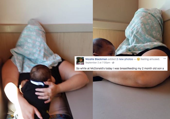 Blackman was at a local McDonald's south of Seattle feeding her 3-month old son Cameron recently. The two were in a corner of the restaurant, Cameron feeding happily, when a woman reportedly approached Blackman and asked her to "cover up." She told The Independent: