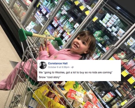 What began as a simple Facebook post showing her adorable daughter riding in the grocery cart during some shopping quickly turned into a smorgasbord of criticism and judgement. Hall, an Australian mother of four, blogger, and popular social media figure explained in her caption that her daughter was having none of her solo-shopping fantasy and therefore tagged along. Rather than chime in on the lost reality of unaccompanied grocery shopping as a mom, many commented on Hall's choice of groceries instead. But calling her out for the "junk food" that she was buying wasn't enough. Many moms were somehow outraged by the way in which she organized her food — um, what?