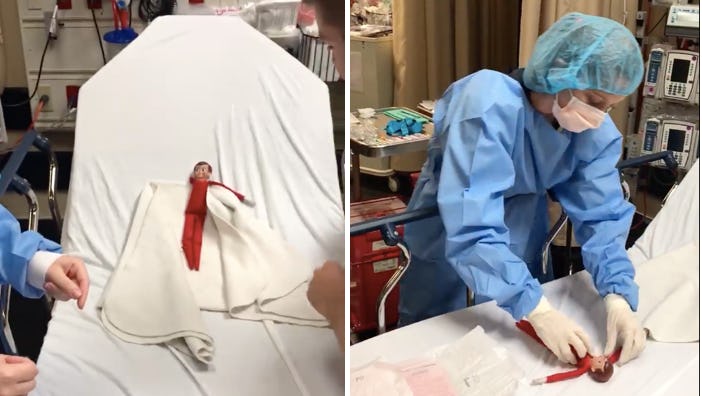 Oh, the lengths parents will go to keep the holiday magic alive for their kids. The elaborate schemes so many contrive (including myself) to shield their children from the cold, harsh reality of a world without Santa and his elves. I'm not going to lie; I just felt slightly panicked even typing those words on the off-chance a small child might read them. Santa has always been well-guarded, but now we have to worry about his (oft creepy) little helper, the Elf on the Shelf. This mom who went above and beyond for her daughter's "injured" Elf on the Shelf wins the gold medal for sweet kid duping in 2017. The things we do for love.