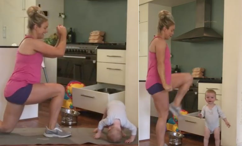 Strode, a native of Australia, noted that this particular workout "is Pregnancy, postpartum and DR safe," featuring modified positions for such moves as Push-ups and Commandos. Modified positions like these are perfect for a beginner or anyone needing to take it easy, so there's really no excuse not to give it a try. As you can see in the clip, even a baby can do it. In fact, you've got to watch to see little Madi's version of squats (there's really nothing like a baby doing squats in a onesie).