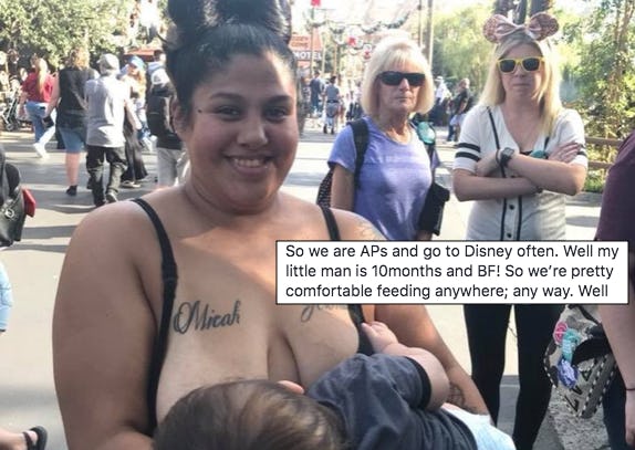 On Sunday, Brittni Medina shared a photo with the Breastfeeding Mama Talk Facebook group, along with caption that explained her recent shaming experience. The California mama, who has Disneyland season passes with her husband, wrote, "So we are APs and go to Disney often. Well my little man is 10months and BF! So we’re pretty comfortable feeding anywhere; any way. Well these ladies were so angry by it my husband just had to take a picture. Peep the haters. Characters of the day. Just had to get a picture!"