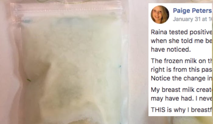 Paige Peterson posted a side-by-side photo on Facebook of two bags of her breast milk, one that was pumped two weeks earlier and another pumped more recently when her daughter came down with the flu. The first bag was off-white in color, while the second was yellow. Peterson explained in her post, which has gained more than 39,000 reactions and 41,000 shares on Facebook, that the change was due to her daughter's illness: