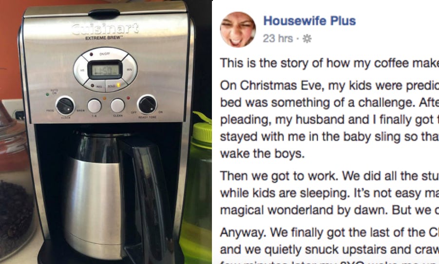 Christmas is over, and much like the pain of child birth, the memories are beginning to soften around the edges a little for parents everywhere. Memories of those stressful hours of shopping are starting to be replaced by sweet thoughts of Christmas Eve snuggled up by the Christmas tree. Because this is how most people manage to get excited every year; you have to forget the stress and retrain your brain to remember all of the good things. It's a good idea to write some of the better stories down, like this mom's post about how her coffeemaker saved Christmas. She's going to want to hold on to this gem from year to year, because you know it's going to become part of her family lore.