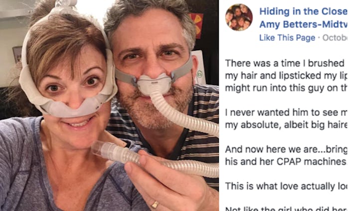 Anyone who has been with the same person long enough that the honeymoon stage feels like a distant memory will likely agree that it can be easy to romanticize the early days of a relationship. Working, paying bills, doing housework, and raising a family seems to inevitably take even the hottest coupling down to an at-times unenthusiastic simmer, and, let's be honest, even when you try to keep things fresh, the intense familiarity of long-time love can make it difficult to keep the spark alive. But that's why this mom's post about "what love actually looks like" after more than two decades together has so many people cheering. Because as blogger Amy Betters-Midtvedt so perfectly noted in a recent Facebook post, sometimes real, lasting love just looks like two people wearing matching CPAP machines.