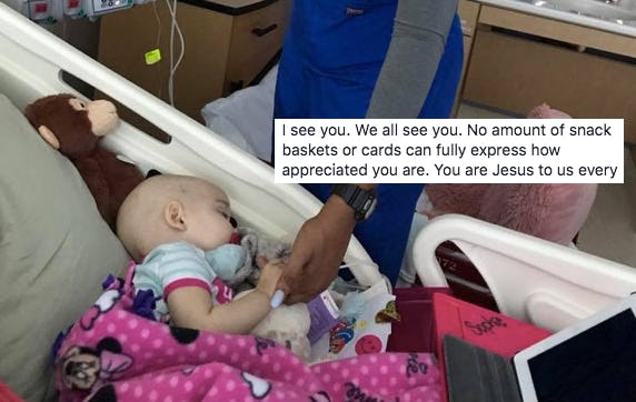 "This is so beautiful. I couldn't agree more. Thank God I've never had a sick child, but I work in a children's hospital and cannot say enough about our staff," one person commented.