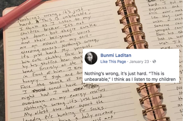 Laditan went on to describe what trying to get her kids out the door looks like; pulling her coat over her pajamas and giving her kids a final once-over to make "sure they look like they come from a home with a mother who cares." She then agonizes over the specific needs of each of her three children, and how she feels like she's somehow letting them down: