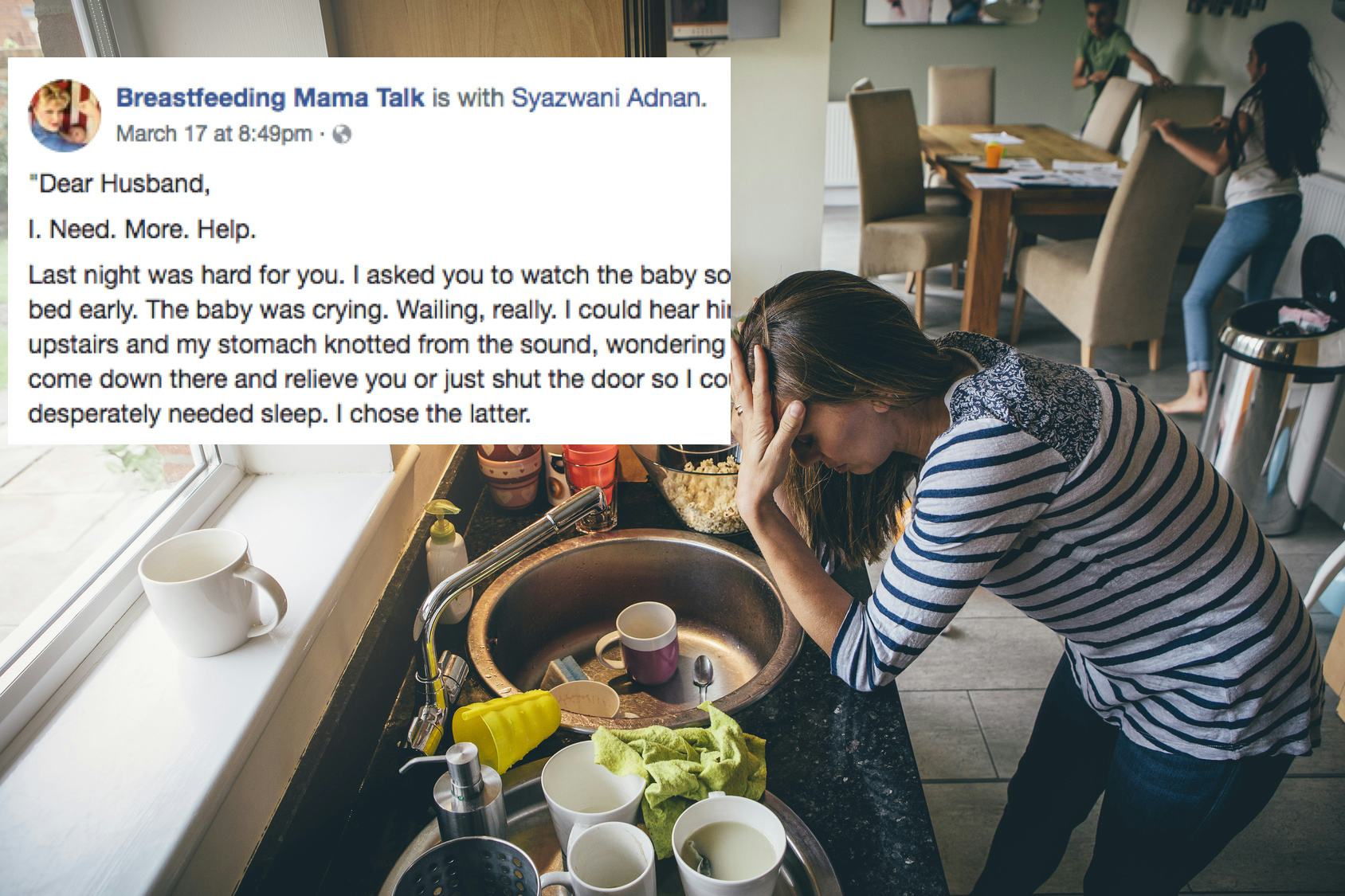 "Dear Husband, I. Need. More. Help," she began her post. She goes on to explain that their new baby was crying, "Wailing, really," and she could hear him from their upstairs bedroom. She weighed her options of going downstairs and relieving her husband or getting a bit more "desperately needed sleep," and chose self-care in the form of the latter.