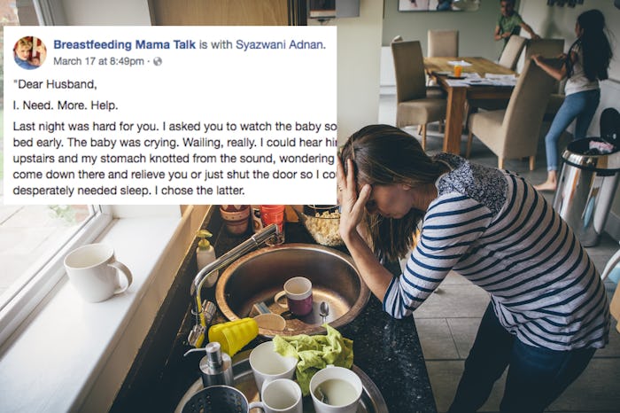 Celeste Erlach is a mother of two, with a toddler and a new baby to keep track of. Her days are long and her nights are even longer. After one particularly rough day, rather than stew over all of the help that she wasn't getting from him, Erlach wrote out her needs in a poignant open letter to her husband that details just what she is asking him for. She shared the post with the popular Facebook page, Breastfeeding Mama Talk, where it generated a lot of comments from moms who feel her pain.