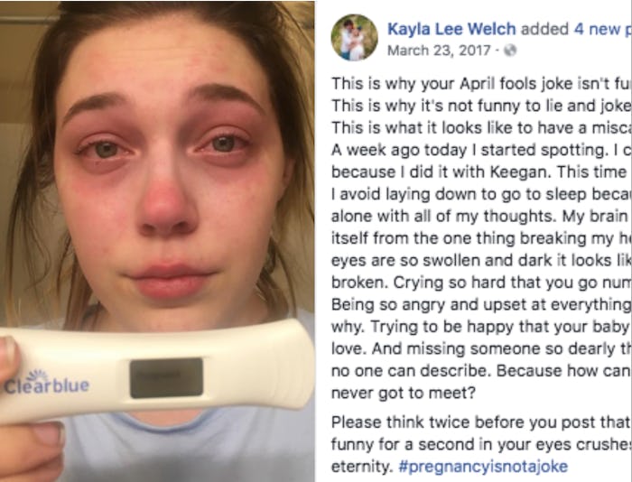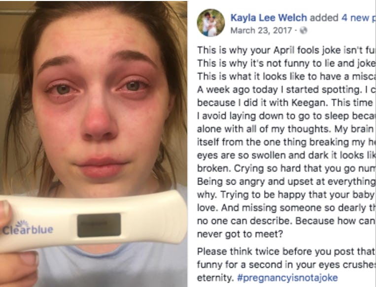 Just a week after miscarrying in March 2017, Kayla Lee Welch posted her experience to Facebook in an effort to show her followers what miscarriages really look like. She explained that the pain she was going through was exactly why pregnancy posts are inappropriate jokes. Welch wrote that she was experiencing spotting, and convinced herself that it was normal as she had spotted with her first pregnancy — but this time it was not normal. She was miscarrying.