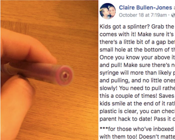 Claire Bullen-Jones — a mom of two who hails from Wigan, England — recently posted her genius hack for removing splinters on Facebook and the parents of the internet are big fans. In her post, she wrote, "Kids got a splinter? Grab the Calpol box and take out the syringe that comes with it! Make sure it’s clean obviously!"