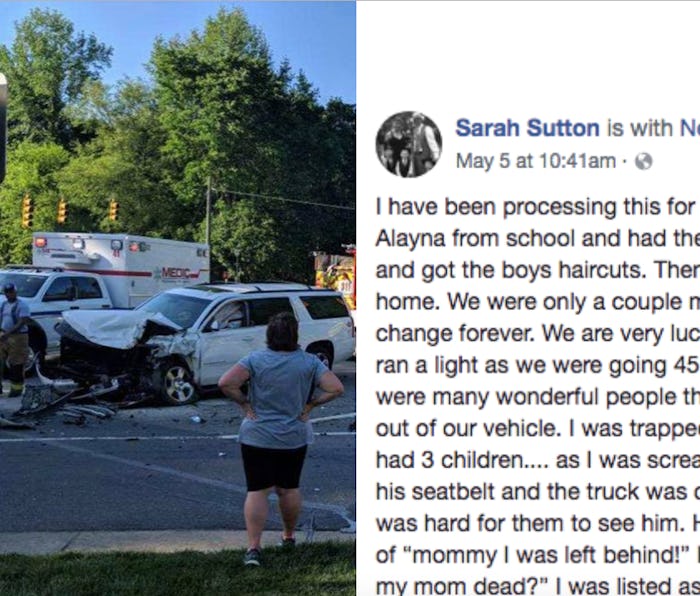 Mom of four Sarah Sutton of Weddington, North Carolina, was recently involved in a head-on collision that could have ended so differently if her children weren't all safely secured in car seats with five-point harnesses. As Scary Mommy reported, Sutton was running errands with all four of her children on Wednesday, May 2, when it happened just a couple of miles from their home. "We are very lucky that we are here to tell our story," Sutton wrote in a now-viral Facebook post. "A man ran a light as we were going 45 mph and crashed into us head on! There were many wonderful people that stopped. People had to pull our children out of our vehicle. I was trapped inside." She continued: