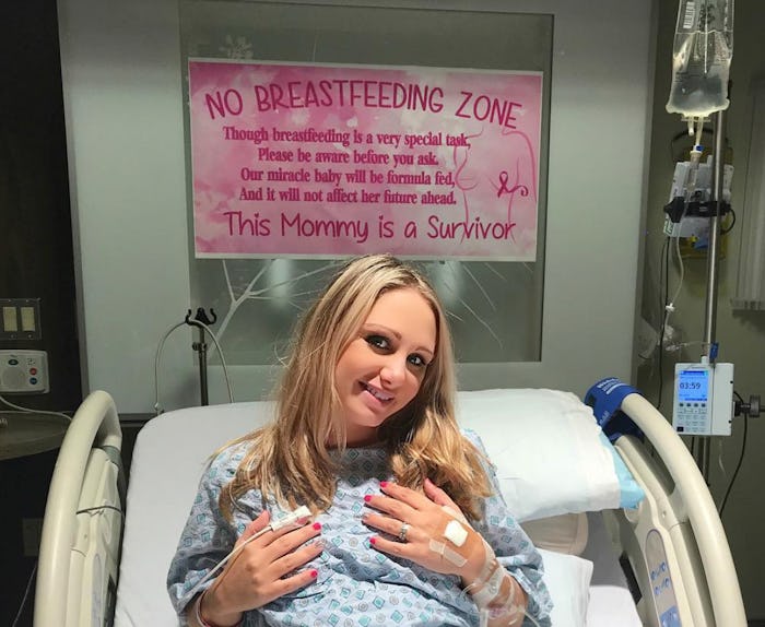 New mom Meghan Koziel wants to make life a little easier for people who can't breastfeed their newborns. Koziel, who survived a 2015 breast cancer diagnosis at the age of 26, got the idea shortly before she gave birth to her daughter, Kendra, on Sept. 15, according to Parents. To avoid a discussion about her mastectomy and difficult medical journey, a friend suggested Koziel hang a sign in her room detailing her history. And a day before Kendra's arrival, Koziel hung a pink sign above her hospital bed that read, according to Instagram: "NO BREASTFEEDING ZONE. Though breastfeeding is a very special task, please be aware before you ask. Our miracle baby will be formula fed, and it will not affect her future ahead. This mommy is a survivor."