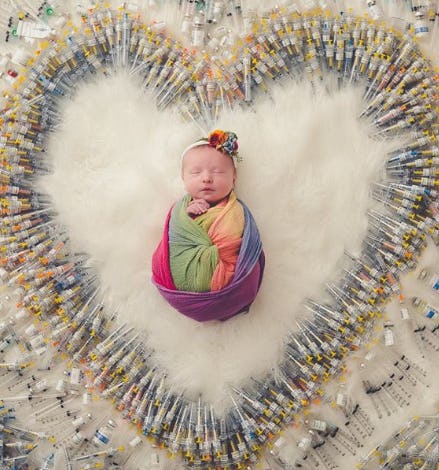 Little London was born to parents Patricia and Kimberly O'Neill just last month. And much like so many new parents in the world, the couple from Arizona took their 2-week-old baby to a local photographer to have some keepsake portraits taken. Only in this case, London's parents wanted something special. As photographer Sarah Packer explained to Romper via email; "The family came to me for a newborn session and asked if I could incorporate the IVF needles somehow. They gave me creative freedom and I knew I wanted to do something special that would be artistic as well as sentimental."